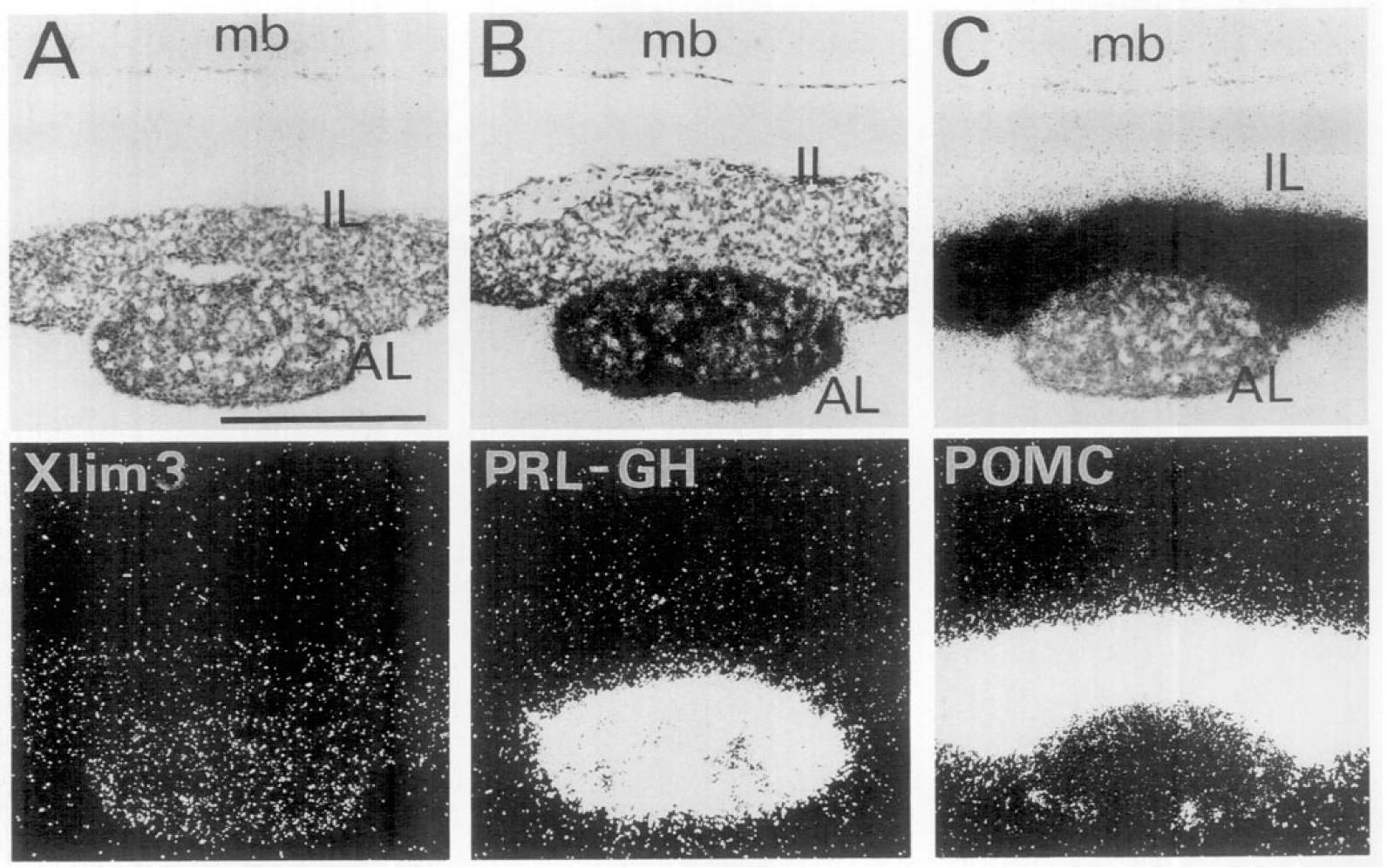 prolactin and growth hormone (B) and proopiomelanocortin (C) (Hayes and Loh, 1990). Xlim-3 mRNA is expressed in both lobes but not