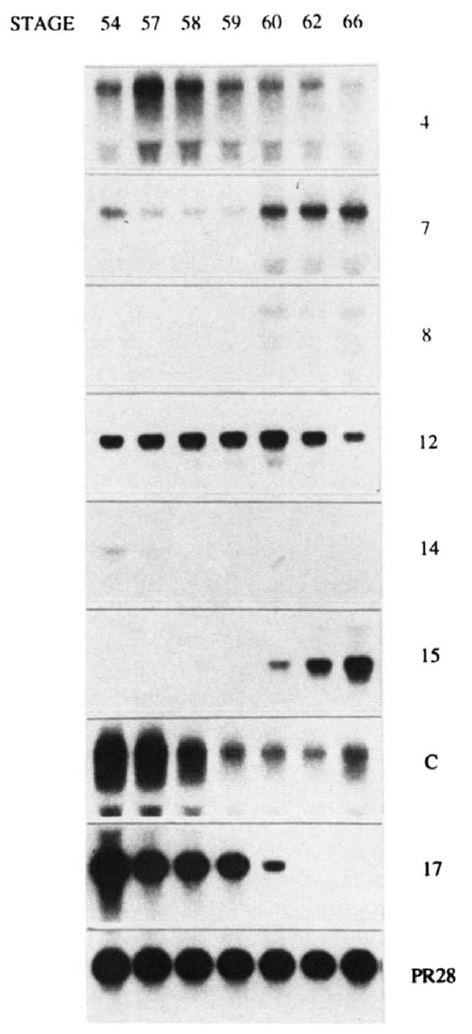 to gene 8. Developmental expression of genes 14 and B is similar to