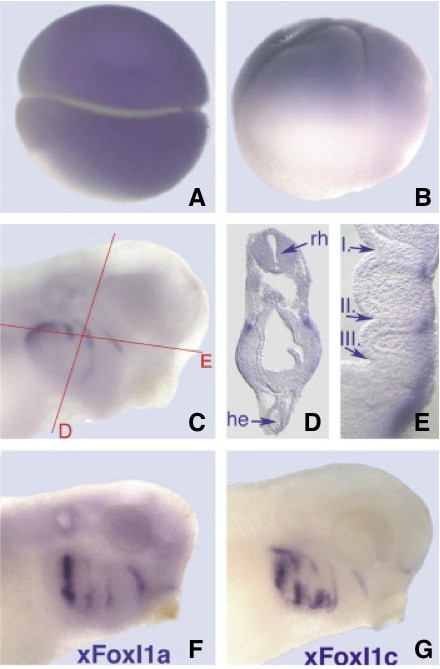 Fig. 3. Whole mount in situ hybridisation of xlFoxI2. (A) 2-cell stage, animal view; (B) 4-cell stage, lateral view; (C) stage 35, the red lines denote sections shown in (D,E) which are transverse and horizontal sections respectively, through the dorsal epibranchial placodes; (F) stage 35 stained for xlFoxI1a; (G) stage 34 stained for xlFoxI1c. he, heart anlage; rh, rhombencephalon; I., II., III., first, second and third visceral pouches.