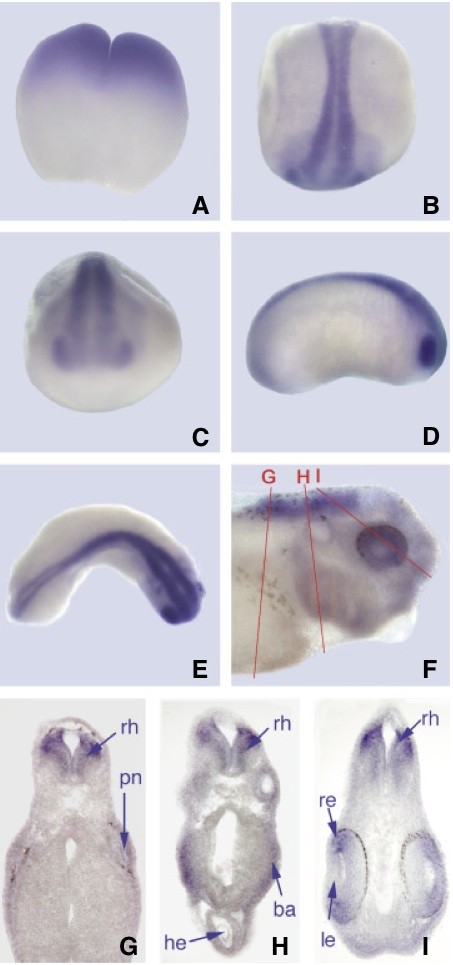 Fig. 5. Whole mount in situ hybridisation of xlFoxM1. (A) 2-cell stage, lateral view; (B) stage 16, dorsal view, anterior to the bottom; (C) stage 19, anterior view; (D) stage 22, lateral view; (E) stage 26, dorsal view; (F) stage 35; in (D-F), anterior is to the right. Red lines in (F) denote sections shown in (G-I). (G) Transverse section revealing xlFoxM1 expression in the rhombencephalon; (H) transverse section demonstrating additional stain- ing of the branchial arches; (I) horizontal section of the head with staining of the retina, anterior is to the bottom. ba, branchial arches; le, lens; he, heart; pn, pronephros; rh, rhombencephalon.