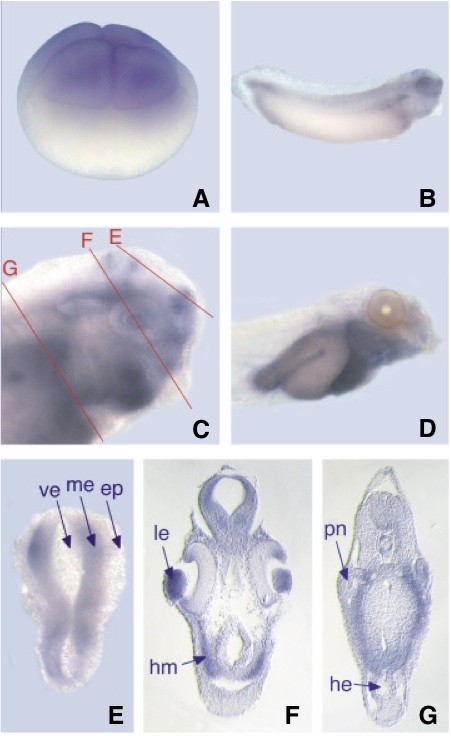 Fig. 6. Whole mount in situ hybridisation of xlFoxP1. (A) 8-cell stage, lateral view; (B) stage 31; (C) stage 35, red lines in (C) indicate the plane of sections shown in (E-G); (D) stage 41, (B-D) are lateral views; (E) horizontal section, anterior is to the bottom; (F,G) transverse sections, dorsal is on top. ep, epidermis; he, heart; hm, head mesenchyme; le, lens; me, mesencephalon; pn, pronephros; ve, brain ventricle.