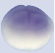 foxp1 [forkhead box P1] gene expression in Xenopus laevis embryo, assayed via in situ hybridization, NF stage 4 (8 cells), lateral view, dorsal up.