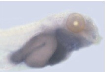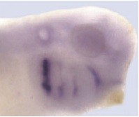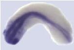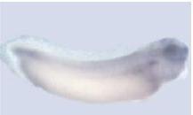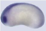foxm1 (forkhead box M1 ) gene expression in Xenopus laevis embryo, assayed via in situ hybridization, NF stage 22, lateral view, dorsal up, anterior left.