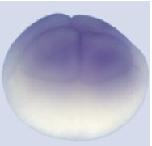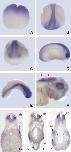 foxm1 (forkhead box M1 ) gene expression in Xenopus laevis embryo, assayed via in situ hybridization, NF stage 19, anterior view, dorsal up.