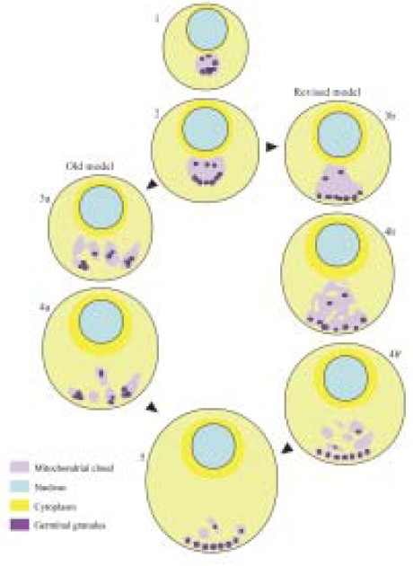 2 indicate stage I of oogenesis, in which the spherical mitochondrial cloud