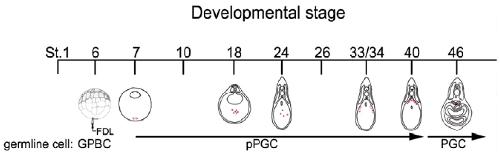 7–40. The germline cells derived from GPBC were designated as pPGC in embryos at stages 7–40, and as PGC in embryos from stage