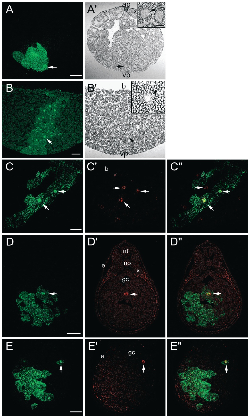 cells. Bar, 200 μm (D) The embryo in (D) stained with the 2L-13 antibody. The perinuclear cytoplasm of the cell (arrow) is strongly stained with the antibody, so that the cell is identified as a pPGC. The position of the nucleus seems to be empty. (D ) A merged image of (D) and (D'). (e) An FDL-injected embryo at stage 33/34. An FDL-labeled cell (arrow) is found as individual cells in the dorsal part (cf. Figure 2) of the endodermal cell mass, which is distinctly separated from a cluster of labeled somatic endoderm cells. Bar, 100 μm (E) The embryo in (E) is stained with the 2L-13 antibody. The FDL-labeled cell (arrow) is shown to be a pPGC by the positive stain in the perinuclear cytoplasm. The position of the nucleus seems to be empty. (E) A merged image of (E) and (E'). The top is the animal and bottom the vegetal side in (A) and (B), and in (CâE) the top is the dorsal and bottom the ventral side.