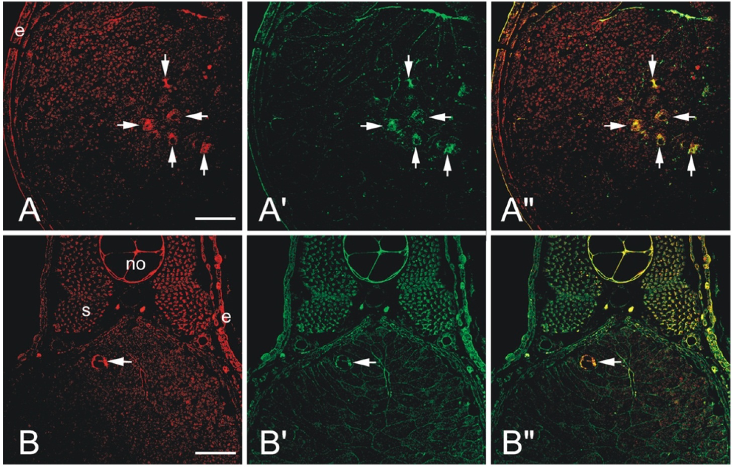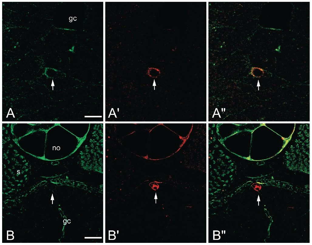 Fig. 5. The double staining with the anti-actin and 2-L-13 antibodies for transverse, polyester wax sections of stage-28 (A) and stage 40 (B) embryos. The position of the nucleus in (AâAâ) and (B-Bâ) seems to be empty. (A) A strong fluorescence representing actin is observed in the cytoplasm surrounding the nucleus of an endoderm cell (arrow) in the centro-dorsal part (cf. Figure 2) of the endoderm cell mass of the embryo. (Aâ) A similar part of the cell is also stained with the 2L-13antibody specific to the pPGC, indicating that the cell is a pPGC. (Aâ) A merged image of (A) and (Aâ) where coincidental staining is seen as yellow, revealing a partial overlap in the perinuclear cytoplasm.(B) The fluorescence for actin is not detected in the perinuclear cytoplasm of a cell or a pPGC (arrow) at the uppermost dorsal part of the endoderm cell mass (cf. Figure 1) of the embryo. (Bâ) The perinuclear cytoplasm of the pPGC is strongly stained with the 2L-13 antibody. (Bâ) A merged image of (B) and (Bâ). No overlap is seen in the pPGC, implying that the pPGC in the stage 40 embryo no longer has enough detectable actin. The top is the dorsal and bottom the ventral side. gc, gut cavity; no, notochord; s, somite. Bar, 50 μm.