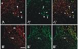 Fig. 7. (A,B) The double staining with the anti-CXCR4 and 2L-13 antibodies for a transverse section of embryos. (A) The molecule recognized with the anti-CXCR4 antibody, probably Xenopus CXCR4 (xCXCR4), is mostly detected throughout the cytoplasm of an endoderm cell (arrow) in the dorsal part (cf. Figure 2) of the endoderm cell mass of a stage 33/34 embryo. (A ) The perinuclear cytoplasm of the cell (arrow) in (A) is strongly stained with the 2L-13 antibody, indicating that the cell is a pPGC. (A ) A merged image of (A) and (A ). xCXCR4 is seen throughout the cytoplasm of the pPGC (arrow) while XVLG1 protein recognized with the 2 L-13 antibody is prominent in the perinuclear region. xCXCR4 is not always present in pPGC because it is not detected in a pPGC (arrowhead) situated more dorsally. The top is the dorsal and bottom the ventral side. Bar, 20 μm (B) No endoderm cell in the central part of the endoderm cell mass, including pPGC of a stage 23 embryo, is stained with the anti-CXCR4 antibody. (B ) The perinuclear cytoplasm of five cells (arrows) are stained with the 2L-13 antibody, indicating that they are pPGC. (B ) A merged image of (B) and (B ). xCXCR4 is never observed in the pPGC (arrows) at stages younger than 23. The top is the dorsal and bottom the ventral side. Bar, 50 μm. (C,D) In situ hybridization for polyester wax sections of a stage 28 embryo with riboprobes of xCXCR4. xCXCR4 RNA is prominent in the nucleus of three pPGC (arrows) in the lateral part (cf. Figure 2) of the endoderm cell mass with the antisense probe (C) while it is rarely detected in a pPGC (arrow) on the adjacent section of (C) with the sense probe (D). The pPGC are easily identified by the possession of a granular cytoplasm in the perinuclear region. Bar, 20 μm.