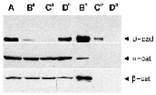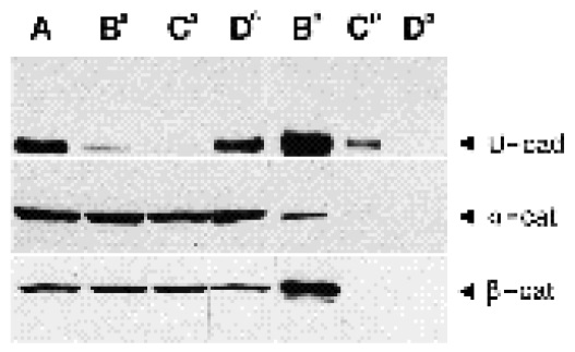 were analysed by immunoblotting using anti-E-cadherin (lane 1), anti-a-catenin (lane 3) and anti-b-catenin (lane 5). For controls in B and