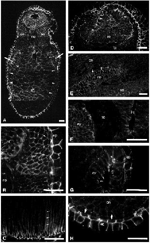 neurula stage 19 embryo. Arrowheads point to the apical membranes of the endoderm. (D) Embryos at stage 17 and (E) at stage 19 were