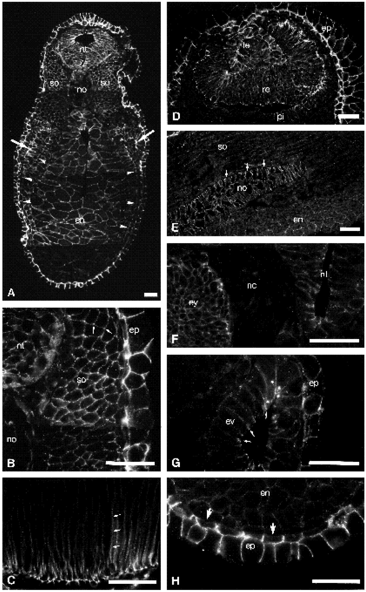 Fig. 10. Distribution of a-catenin in the stage 27 tailbud embryo. (A) Transversal section showing staining patterns in different organ anlagen, particulary in the neural tube, pronephros anlage (arrows) and lateral plate mesoderm (arrowheads). (B, C, F, G and H) Details of transversal sections; (D,E) details of parasagittal sections. (B) Somite, arrows indicate the inhomogenuous staining pattern around the somite cells. (C) Cement gland, arrows point at a lateral plasma membrane of a columnar cell. (D) Eye vesicle. (E) Notochord, plasma membranes bordering the basal lamina are indicated by arrows. (F) Neural crest cells are unstained. (G) Ear vesicle, junctional concentrations of a- catenin are indicated by arrows. (H) Ventral epidermis, cell membranes of the bilayered epidermis adjacent to the basal lamina exhibit only weak staining (arrows). en, endoderm; ep, epidermis; ev, ear vesicle; ey, eye vesicle; le, lens placode; nc, neural crest cells; no, notochord; nt, neural tube; pi, pigment layer; re, retinal layer; so, somites. Same histological procedure as in Fig. 7. Bars: 50 um.
