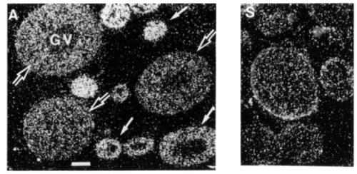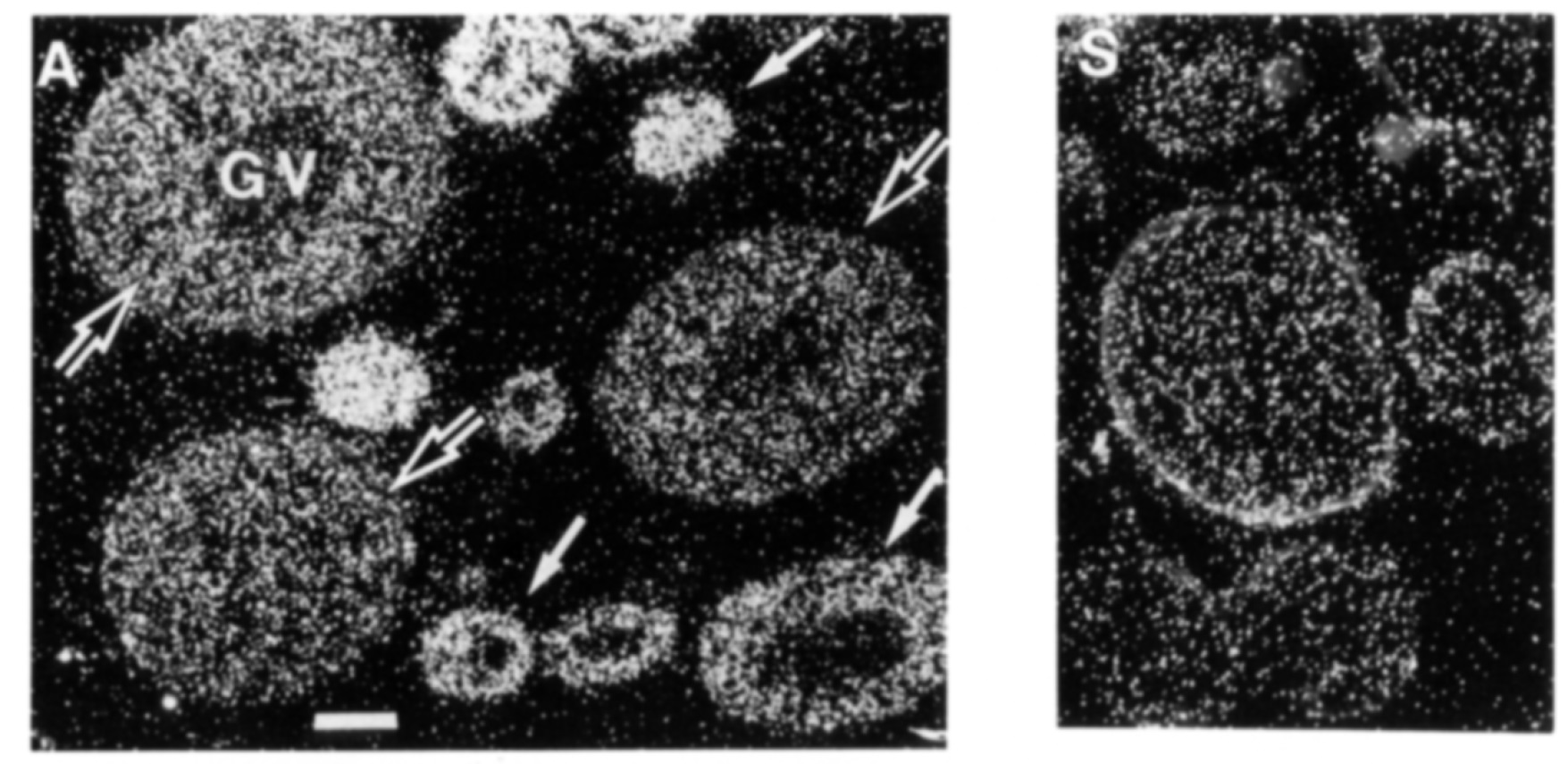 stages Ill-IV (open arrows) and is weak in fully grown oocytes of stages V-VI (data not shown), possibly owing to a large increase in the volume