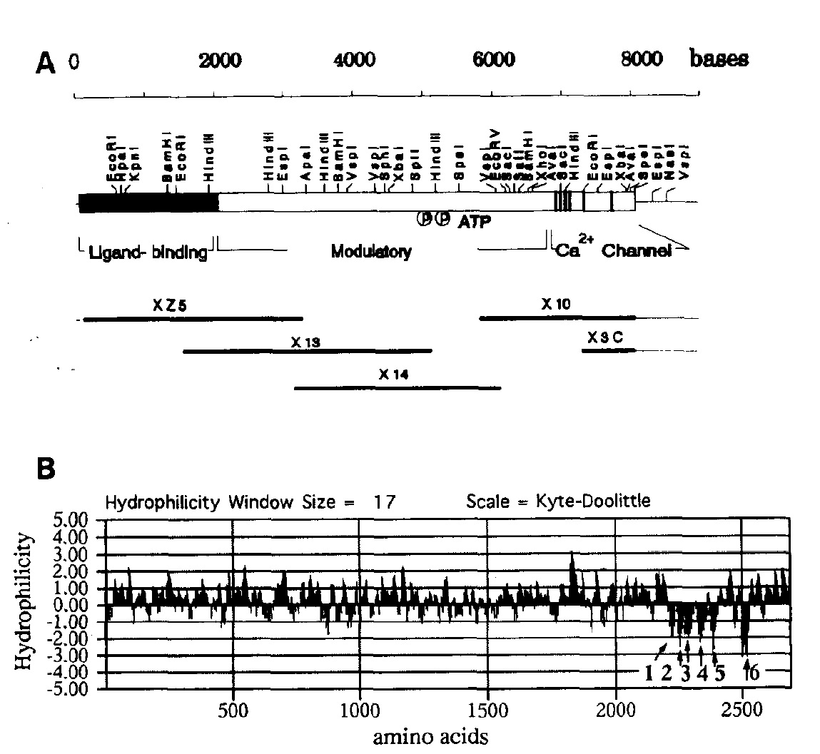 possible phosphorylation sites for PKA (at serine residues 1588 and 1755 in mouse; at serine residues 1575 and 1702 in XIPIR; Huganir et al.,