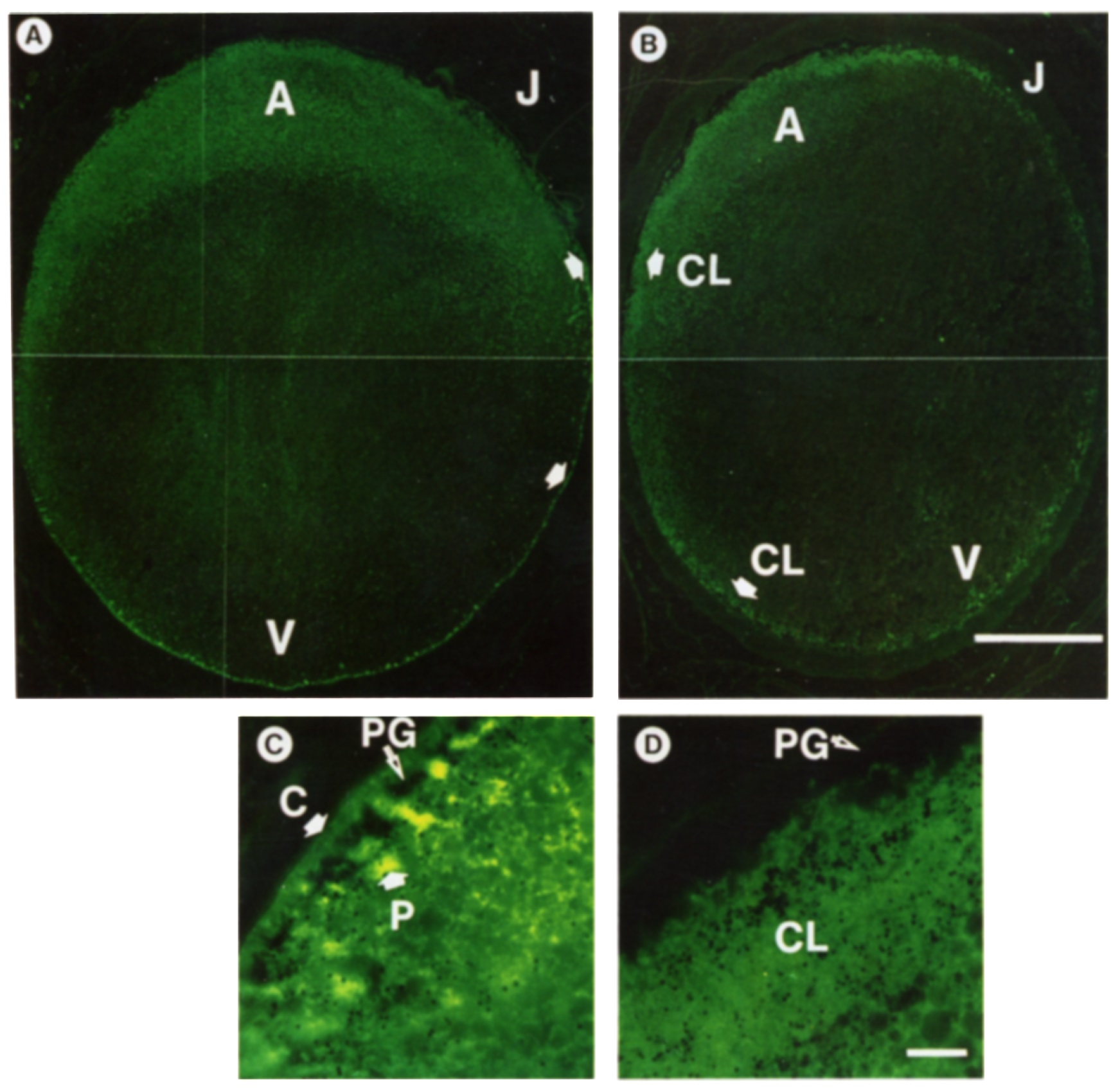 and the signals became fuzzy in the cortical layer (CL). Scale bar is 20 urn and applies to (C) and (D).