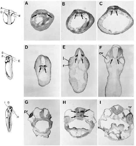 (D-F) a hatching stage (stage 33-34) embryo; (G-I) a swimming tadpole (stage 40) embryo. A, D and G represent sections anterior to the
