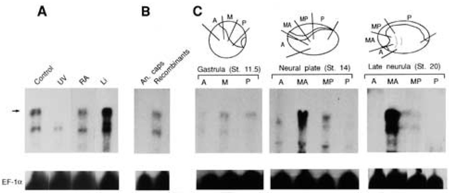 embryos treated with high doses of UV irradiation or retinoic acid, while XeNK2 mRNA levels are enhanced in lithium-treated embryos.