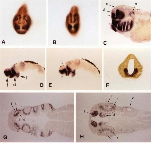 Fig. 4. (A) Whole-mount in situ hybridization to a stage 32 embryo (anterior view) showing the most intense area of XDLL-1 expression in the forebrain - the lateral diencephalic region (arrow) (B) In situ hybridization of XDLL-1 to a stage 33/34 embryo (anterior view), At this stage the entire ventralforebrain is uniformly labeled. (C) A lateral view of the embryo in (B) showing the boundaries of XDLL-1 hybridization within the brain. Upper arrow (e) points at the epiphysis which delineates the dorsal limit of the telencephalon. The lower arrow (d) points at the dorsal limit of XDLL-1 expression boundary in the telencephalon which is ventral to the epiphysis. O, otic vesicle, upper triangle points to the plane of section in (H), lower triangle points to the plane of section in (G). (D) In situ hybridization of XDLL-1 to stage 42 brain. Lateral view. Forebrain is to the left. t, telencephalon; d, diencephalon; i, infundibulum. Apparent signal in the hindbrain area is due to pigment granules and not to hybridization. (E) Wholemount hybridization to stage 43 brain. Arrows indicate the plane of section in (F). (F) Cross section of the telencephalic region of the brain in (E) Notice the sharp boundaries of labeling. (G) Coronal section of the embryo in (c) at the level of pharyngeal arches (lower triangle in (C)). 1, ectoderm; 2, neural crest; 3, mesoderm; 4, endoderm. (H) Coronal section of the embryo in (C) at the level of the eyes (upper triangle in (C)). d, diencephalon; 1, lens; o, otic vesicle; r, retina; t, telencephalon. Notice the presence of hybridization in the retina and the absence of it in the lens.