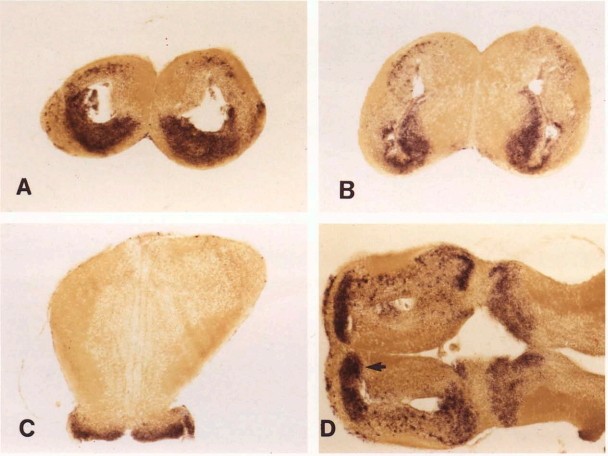 Fig. 6. (A) Transverse section of the telencephalic region in Fig. 5A. Plane of section is indicated by (a). (B) Transverse section of the telencephalic region of the brain in Fig. 5A. Level of the section indicated by letter (b). (C) Transverse section through the mesencephalon and dorsal diencephalon of the brain in Fig. 5A. Plane of section indicated by and letter (c). (D) Coronal section of the brain in 5A. Plane of section is indicated by a letter (d). Arrow points to the strongly labeled area olfactoria primitiva.