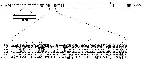 Fig. 1. Deduced amino acid sequences of Xenopus integrin a subunit partial cDNAs. Schematic illustrates the general structural features