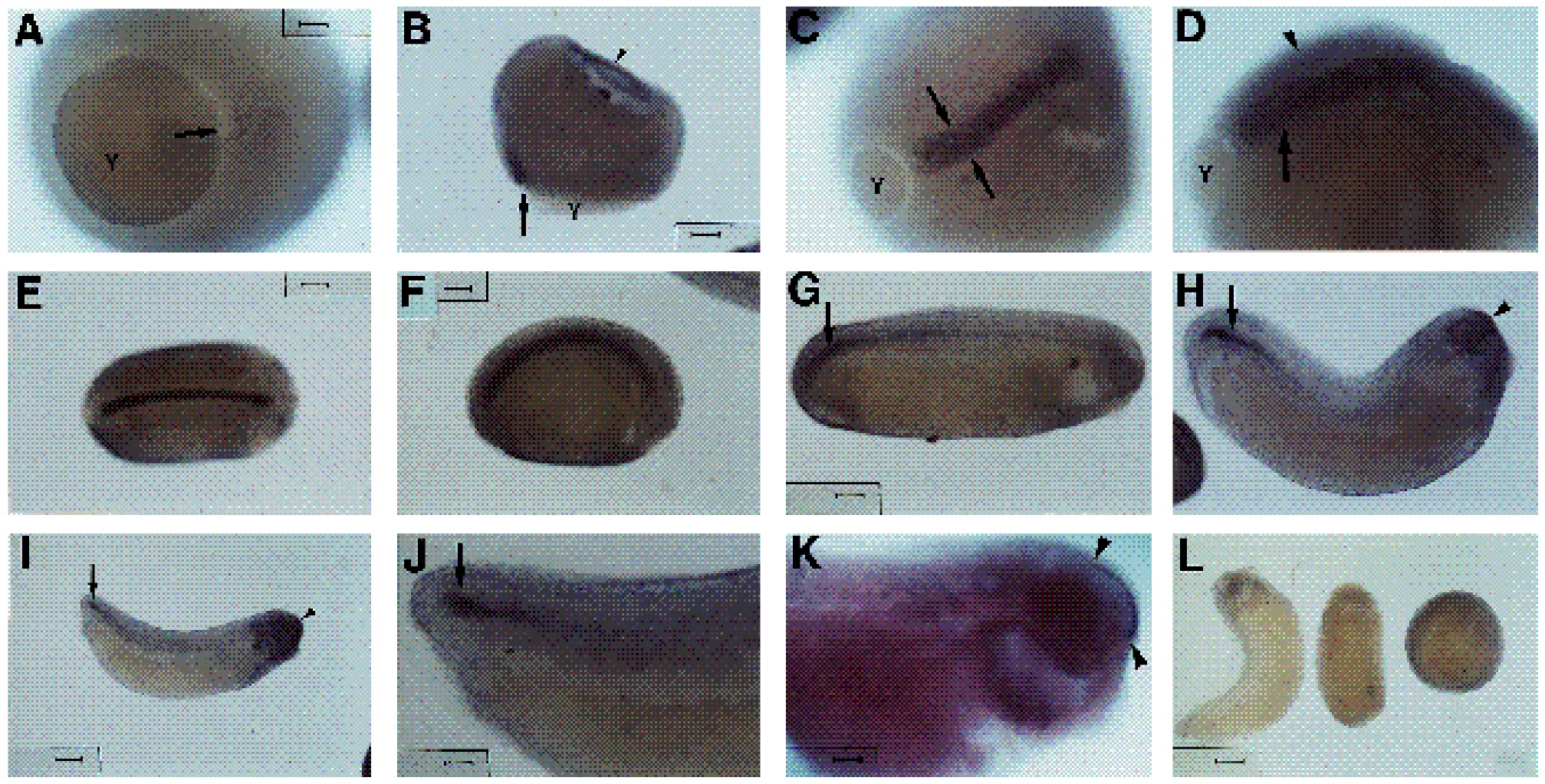 reaction product. Anterior end of embryos is oriented to the right in D-K. (A) Gastrula stage 10.5, vegetal pole view; staining of individual cells in dorsal lip region (arrow). (B) Stage 10.5, side view of dorsal involuting mesoderm (arrow). Arrowheads in B and D indicate faint background staining of outer ectodermal layer also observed with gastrula sense controls (L). Blastocoel roof in B is partially collapsed (arrowhead). (C) Dorsal and (D) side view of stage 12 embryo. Note intense staining of the presumptive notochord (arrows). (E) Dorsal and (F) side view of stage 20 embryo. Expression of a 3 observed along entire length of notochord. Anterior progression of staining extends to the prechordal plate (F). (G) Stage 24, side view. Expression of a3 mRNA in the notochord (arrow) is decreased in the anterior portion. (H) Stage 28 and (I) stage 31 embryos, side views. Staining limited to caudal portion of notochord in the developing tail bud (I). Increased staining detected in the head with pronounced expression at the level of the forebrain (arrowheads). (J) Detail of a stage 31 tail bud. Note intense staining at the caudal tip of the notochord (arrow). (K) Stage 39, optical section of anterior end of embryo visualized by differential interference contrast microscopy. Arrowheads indicate borders of a3 mRNA expression in the prosencephalon. (L) Representative tail bud, neurula and gastrula hybridized with a3 sense transcript. Note faint background staining in ectoderm of gastrula and head of tail bud-stage embryo. Scale bar in A, same as in C,D,J,K, equals 100 fliD. Scale bar in B, same as in E-H, equals 200 fliD. Scale bars in I and L equal400 fliD. Y, yolk plug in A-D