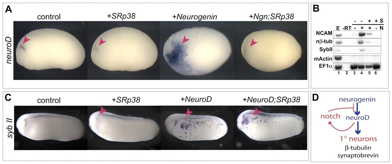 Fig. 4. SRp38 inhibits the activity of neurogenin but not that of neuroD. (A) SRp38 blocks neurogenin induction of neuroD. Stage 15 lateral view, neuroD in situ hybridization. Control embryo: normal expression pattern of neuroD (in trigeminal ganglia indicated by red arrowhead). Expression of 500 pg SRp38 inhibits neuroD expression. However, expression of 250 pg of neurogenin induces ectopic expression of neuroD, while co-expression of SRp38 with neurogenin inhibits induction of neuroD (right embryo). (B) Ectodermal explant RT-PCR. SRp38 blocks neurogenin induction of NCAM, neuronal β-tubulin, synaptobrevin II and neuroD. Analysis of animal caps expressing either 500 pg of SRp38 and/or 250 pg neurogenin as indicated. EF1α is a loading control and muscle actin (mActin) controls for mesodermal contamination. (C) SRp38 does not block neuroD induction of synaptobrevin II (sybII). Stage 25 embryos stained for sybII. Control embryo: normal expression pattern of sybII in trigeminal ganglia and neurons. Expression of 500 pg SRp38 inhibits sybII expression. Ectopic expression of 250pg of neuroD induces ectopic expression of for sybII, while co-expression of SRp38 with neuroD does not inhibit neuroD induction of sybII. (D) Simplified schematic of neurogenic cascade. In the neural plate, neurogenin activates transcription of several downstream genes, including neuroD. neuroD then induces genes characteristic of neuronal differentiation such as neuronal β-tubulin and synaptobrevin. Notch signaling can inhibit the neurogenic effects of neurogenin but not neuroD.
