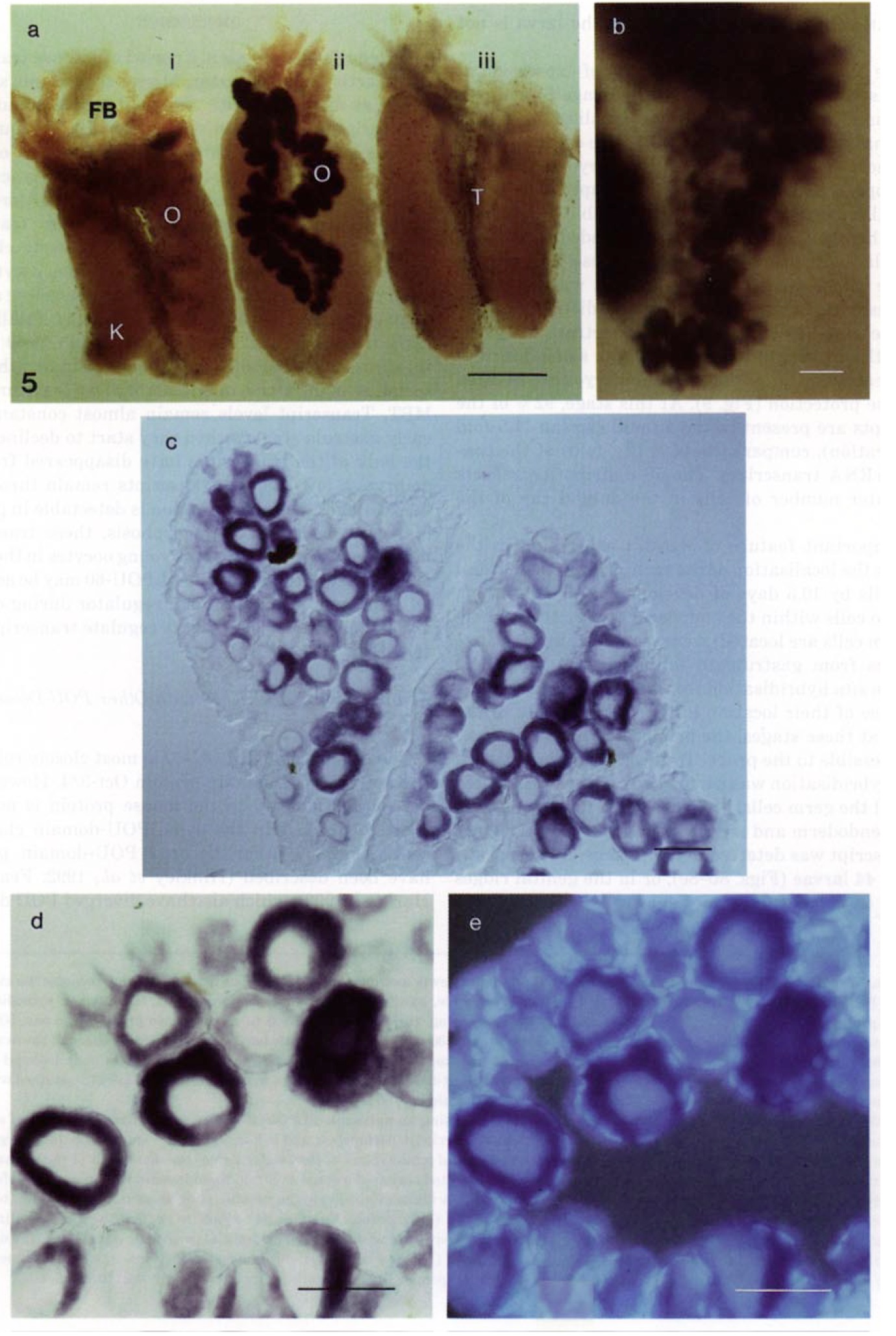 fat body (FB), and developing gonads (0, ovary; T, testis). (i) Female, hybridised to a sense (control) probe. (ii) Female, hybridised to an