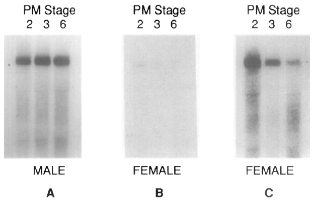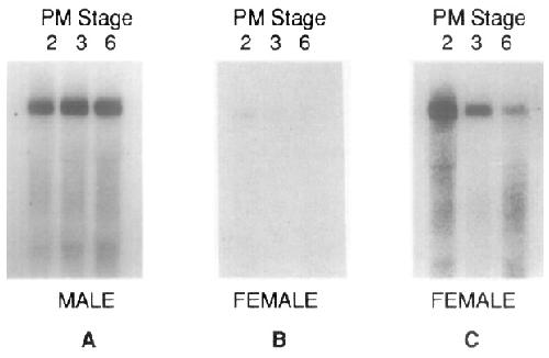 as described in the legend to Fig. 4. A and B, control PM2 females and males, respectively, raised without hormone treatment for 3 weeks. C and