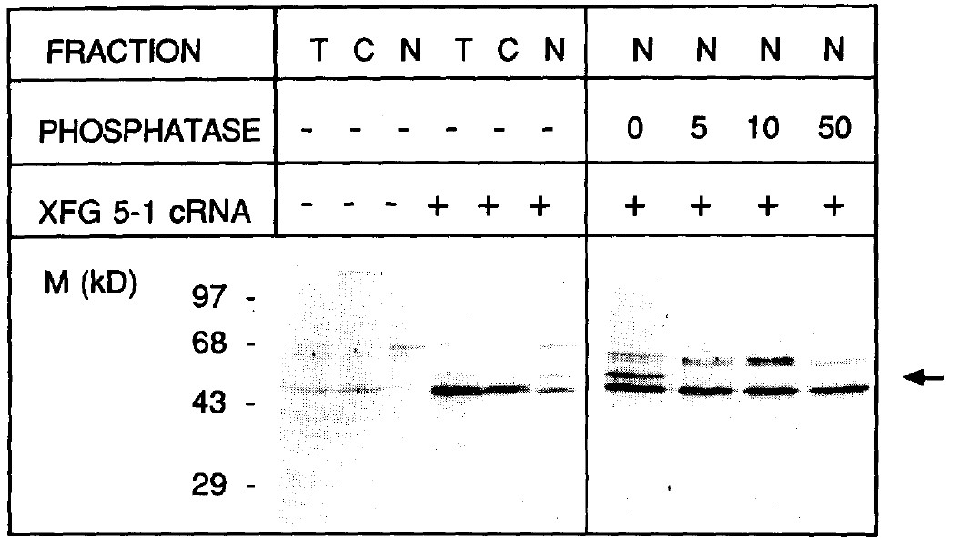 Fig. 3. Nuclear protein preparations contain phosphorylated isoforms of XFG 5-1; Control oocytes and oocytes injected with XFG 5-1 mRNA
