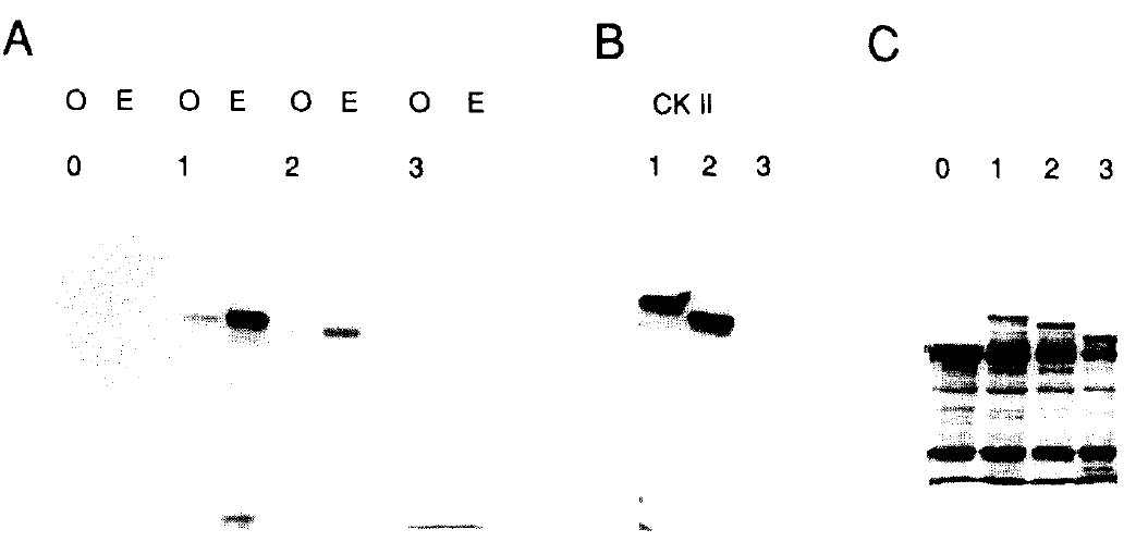 proteins (labelled as in A) were incubated with purified casein kinase II (CKII) and [y-3~P]ATP; protein phosphorylation was analyzed as in A.