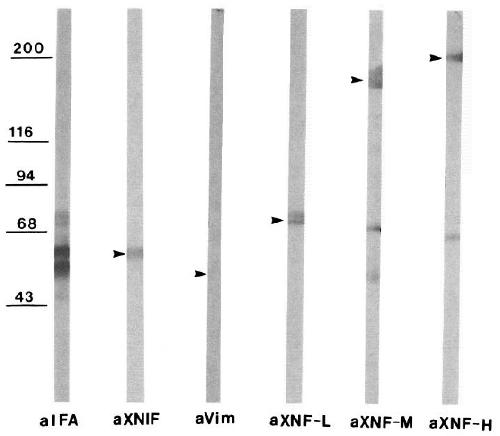 Xenopus laevis is a valuable model system for the study of vertebrate neuroembryogenesis. However, very few well-characterized nervous system-specific molecular markers are available for studies in this organism. We screened a X. laevis adult brain cDNA library using a cDNA probe for mouse low molecular weight neurofilament protein (NF-L) in order to identify neuron-specific intermediate filament proteins. Clones for two distinct neuron-specific intermediate filament proteins were isolated and sequenced. One of these encoded for a Xenopus NF-L (XNF-L) and the other for a novel neuron-specific Xenopus intermediate filament protein (XNIF) that was present earlier and more abundantly than XNF-L during development. XNIF contained a central rod domain with multiple sequence features characteristic of IF proteins. The XNF-L was very similar to mouse NF-L, with a 77% sequence identity in the rod domain and the presence of a polyglutamic acid region in the tail domain, characteristic of type IV neurofilament proteins. In contrast, XNIF showed only 60% identity to mouse NF-L in the rod domain and lacked the glutamic acid-rich sequence in the tail domain. XNIF also had a very low (approximately 38%) sequence identity in the head and tail domains as compared to NF-L and other neurofilament proteins (45% identity to the head domain of alpha-internexin). In the adult frog, XNIF mRNA is detected by Northern blots only within the nervous system and by in situ hybridization histochemistry exclusively in neurons, particularly in the medullary reticular system and spinal cord. Antisera raised against the unique tail region of XNIF detected a single distinct 60 kDa band in Western blots of nervous system cytoskeletal preparations, and this XNIF immunoreactivity was concentrated in axons in the PNS and in small perikarya in the dorsal root ganglion. In contrast, NF-L immunoreactivity was principally in the large perikarya in the dorsal root ganglion. In development, XNIF mRNA appears more abundant than XNF-L mRNA in all premetamorphic stages examined. XNIF mRNA is first detectable at stage 24 (26 hr), whereas stable expression of XNF-L is at stage 35/36 (50 hr). XNIF immunoreactivity is detectable within the cement gland, within many neuronal cell bodies and axon tracts within the developing nervous system, and within all cellular layers of the developing retina. The availability of these two distinct neuron-specific intermediate filament proteins, with different temporal and spatial expression patterns, should provide new markers as well as targets for functional perturbation in the developing X. laevis nervous system.