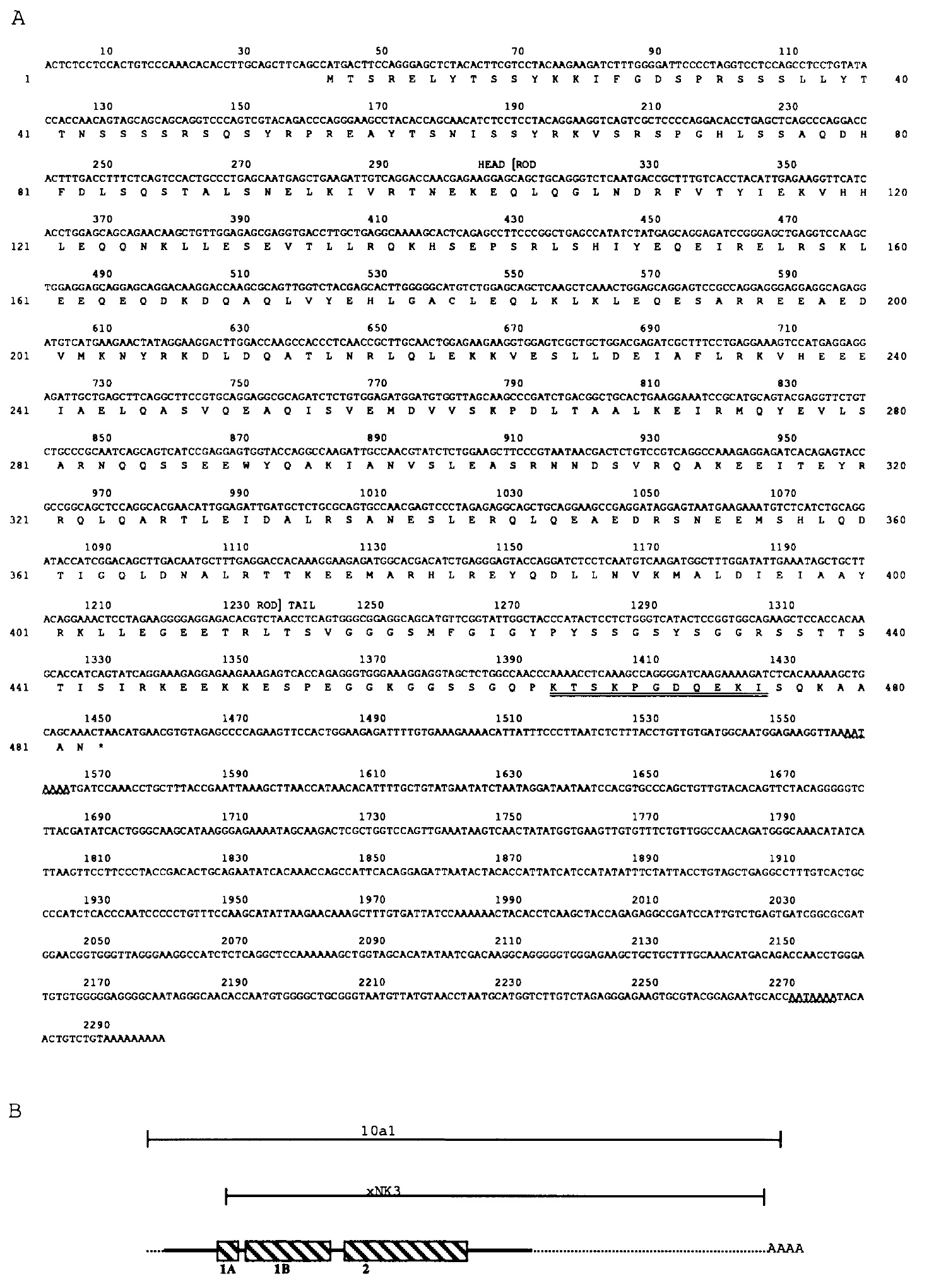 Figure 2. A, Assembled partial cDNA sequence and deduced amino acid sequence of XNF-L. The junctions between head, rod, and tail domains