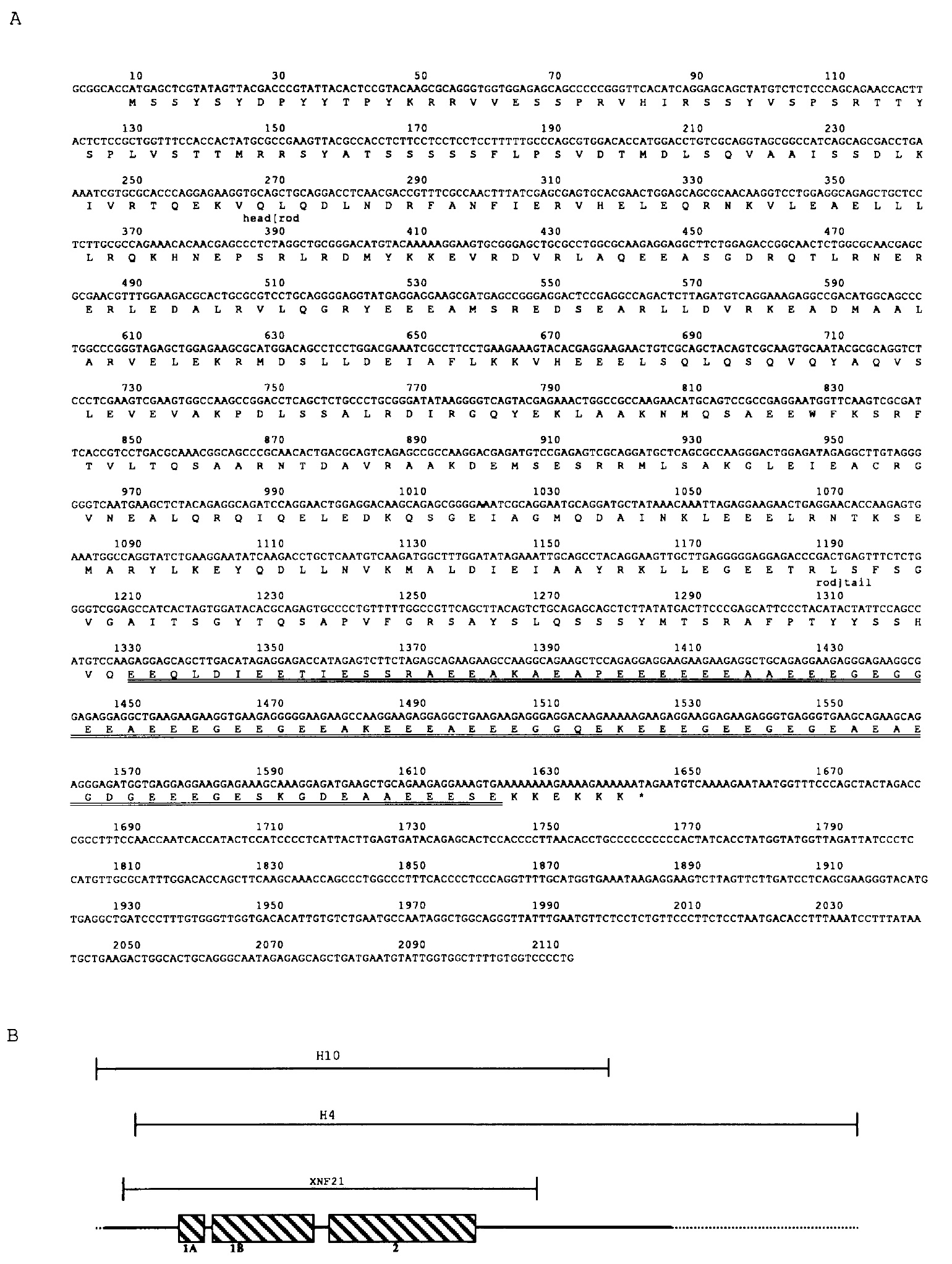 is M86654. B, Schematic drawing indicating relative sizes and overlap of sequence information of clones H4, HIO, and XNF21. The relative