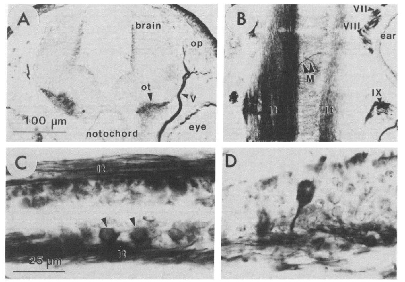 placode. B, Horizontal section through the rhombencephalon of the embryo in A; anterior is up. Arrowheads at VII, VIZZ, and IX point to anti-