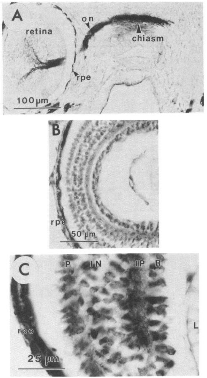 Figure 10. Anti-XNIF antibody immunoreactivity in the developing CNS and PNS. A, Horizontal section through the head of a stage 41 (3-dold)