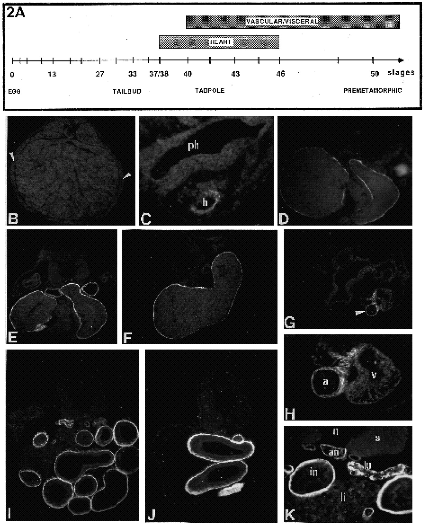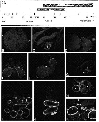 posterior (J) regions. (K) Detail of a stage-47 embryo stained with the a-SM actin antibody, aorta (ao), lung (lu) and intestine (in) present
