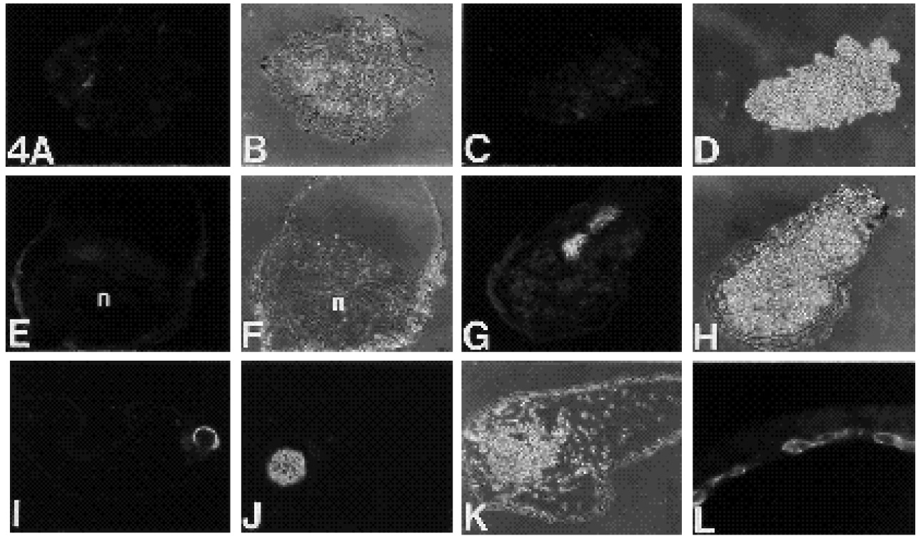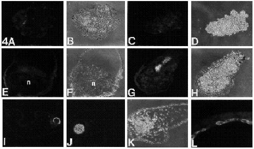 cells within the explant (I,J) or as a layer of cells associated with the differentiated epidermis (L). (K) Phase contrast of (J). Magnification: