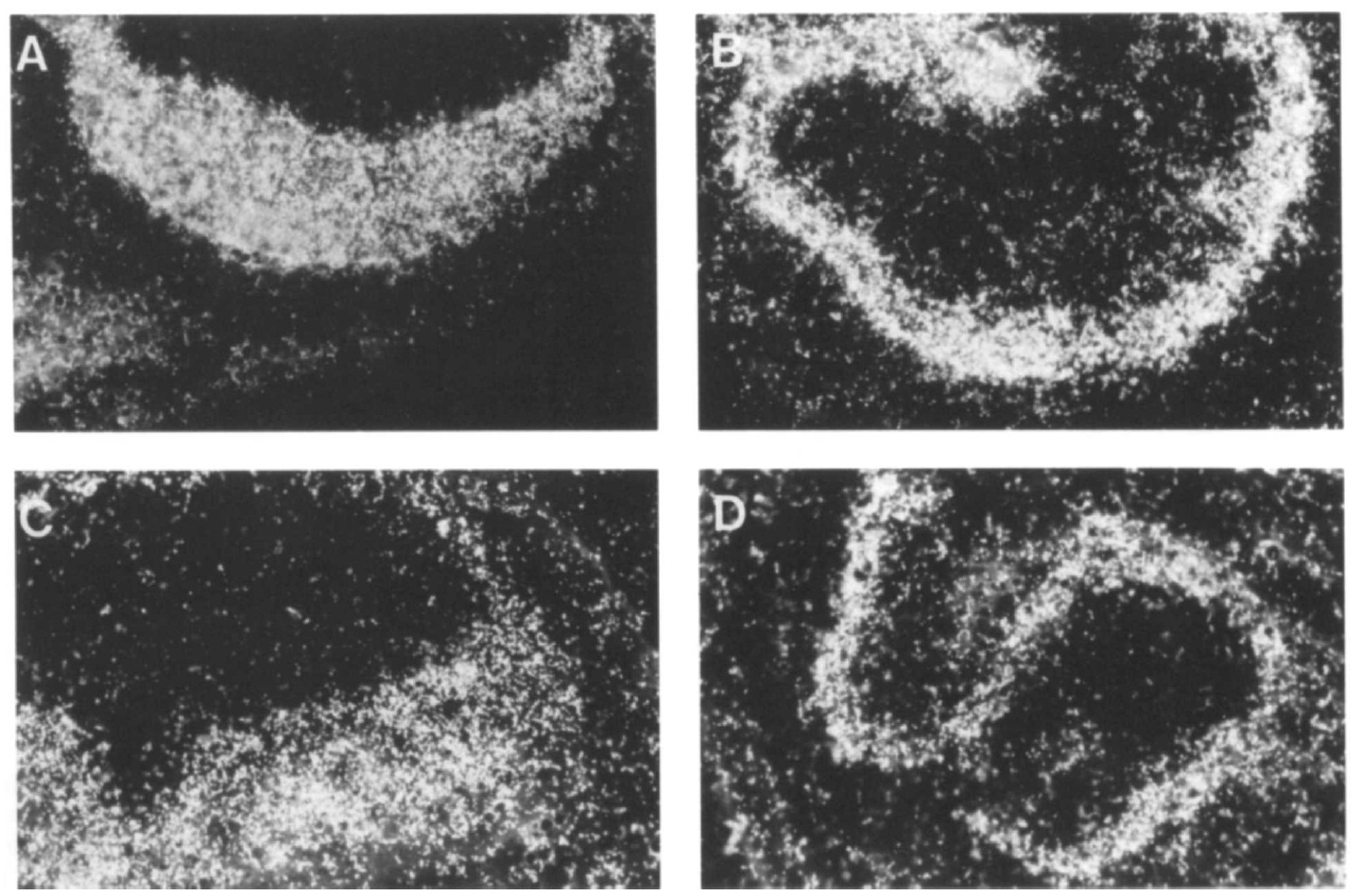 brain (A,C) and the heart (B,D) express high levels of both N-cadherin transcripts revealed with riboprobes