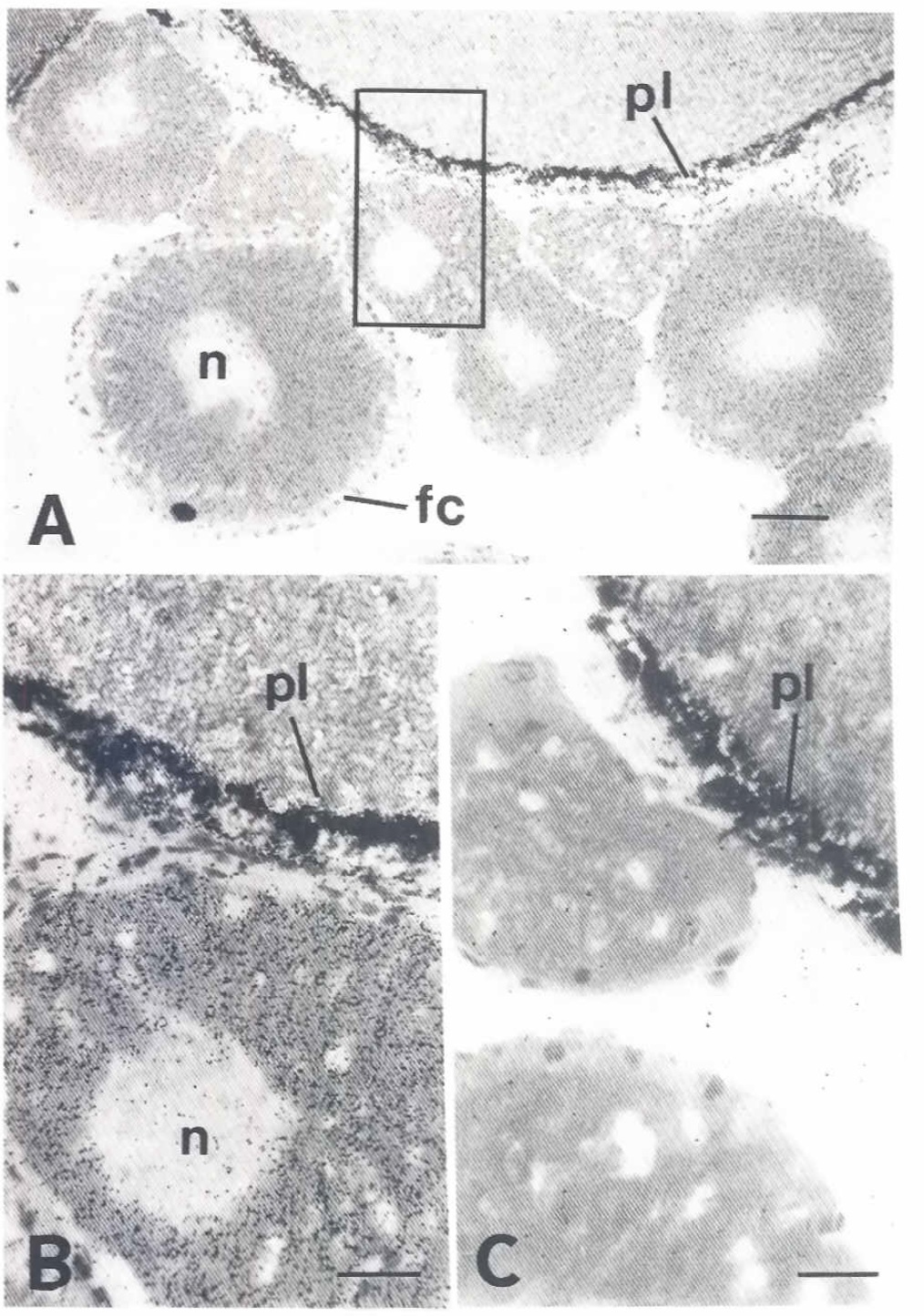 follicle cells, pI, pigmented layer. Scale bar In A. 50 um;in B and C. 15um.