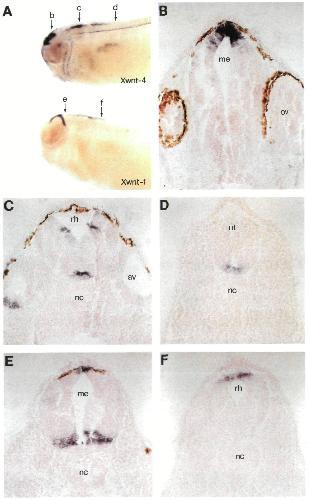 rhombencephalon (arrow 3). (E) Antisense Xwnt-4 probe