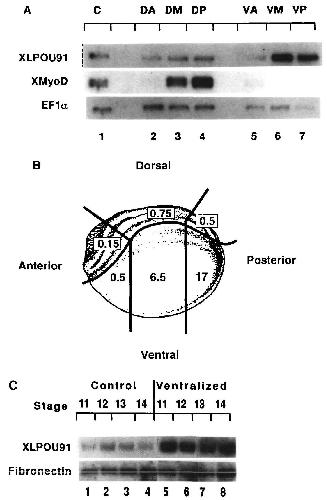 Fig. 2. (A) Expression of XLPOU91 mRNA during