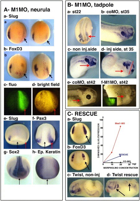 Figure 2. Antisense Morpholino Nucleotide-Mediated Depletion of Msx1 Activity Blocks Neural Crest Induction(A) Msx1-MO inhibited Slug (a) and FoxD3 (b) (stage 16 neurulae, dorsal view). Sibling embryos traced with fluorescence (c and d) showed decreased Slug (e) and enlarged Pax3 (red arrow, f), corresponding to increased Sox2 expression laterally (g) at the expense of the NC and ectoderm domain (h). Small arrow indicates the midline.(B) Phenotype of the Msx1 knockdown in tailbud and tadpoles. ISH for Twist (stage 22, a, dorsal view) and stage 35 (compare b and c to d). Tadpoles exhibit craniofacial defects and decreased melanocyte development (e and f). bâf, lateral views.(C) Dose response and rescue of Msx1 MO injections. At 20 ng dose, Slug expression is reduced in more than 80% of the embryos (red line). This effect is rescued (16%) by the coinjection of Msx1 MO with an Msx1 construct lacking the MO binding sequence (δXT-Msx1, blue line). The control MO (co-MO) does not affect Slug pattern (black line). ISH for rescue of Slug (a) and FoxD3 (b). Sequential injections of Msx1 MO and δXT-Msx1 also restore Twist expression in the cephalic and trunk NC (c, non injected side; d, injected side).