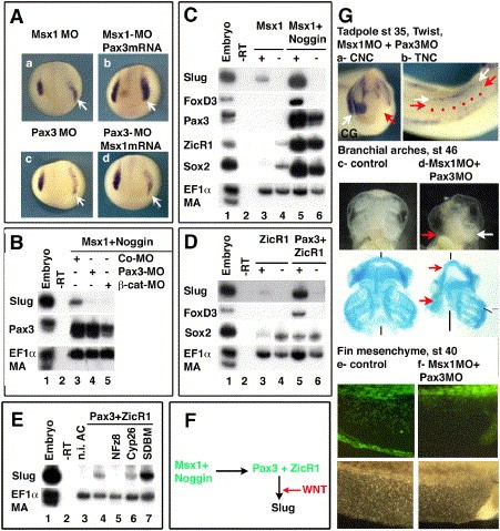 Figure 4. Relationships and Mechanisms of NC Induction by Msx1 and Pax3(A) Epistasis between Msx1 and Pax3 (stage 17 neurulae, dorsal views). When Msx1-MO, which downregulates Slug expression at the neural border (a), is coinjected with Pax3 mRNA (b), Slug expression is restored. The decreased Slug expression observed after injections of Pax3-MO (c) is not rescued by the coinjections of Pax3-MO and Msx1 mRNA (d).(B) RT-PCR analysis on animal caps injected with Msx1 + Noggin in the presence of control (lane 3), Pax3 (lane 4), or β-catenin (lane 5) MOs.(C) In animal cap dissociation assay, Sox2 is induced (lanes 4â6). NC induction observed in nondissociated sibling caps (lanes 5), but not obtained after dissociation (lanes 4 and 6). However, the dissociated cells induce Pax3 and ZicR1 expression (lane 6). Intact animal caps (+), dissociated AC (â).(D) Pax3 + ZicR1 coinjections induce Slug and FoxD3 when the animal caps are intact (lane 5), but not after dissociation (lane6). Intact animal caps (+), dissociated animal caps (â).(E) Pax3 + ZicR1 activation of Slug is blocked by NFz8, but not by cyp26 or a DNA binding mutant of Su(H) (SDBM).(F) Model part 1: Msx1 combined to BMP signaling attenuation activates Pax3 and ZicR1 in explants. Msx1 induction of Slug requires Pax3 activity in vivo and in explants. In turn, Pax3 + ZicR1 are sufficient to activate Slug in vivo and in explants in cooperation with a WNT signal.(G) Phenotype of the double knockdown, Msx1-MO + Pax3-MO. Twist expression is largely depleted in cephalic NC (a, frontal view) and trunk NC (b, white arrows, normal side; red arrows and dots, injected side; dorsal view of the spinal cord). Branchial arch cartilages do not differentiate or are strongly reduced (c and d, ventral views and dissected cartilage). Fin mesenchyme does not form when NC is fluorescently labeled on the injected side (e and f, see Supplemental Data).