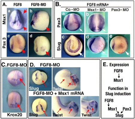 Figure 6. FGF8 Neural Crest Inducing Properties Requires Msx1 Activity(A) Msx1 exhibits a strong response to FGF8 overexpression (50 pg) and is broadly activated on the injected side, including lateral and ventral areas of the embryo (a). The FGF8-AMO (40 ng) abolishes Msx1 expression (b). FGF8 overexpression does not increase the level of Pax3 expression but, rather, expands the Pax3 domain (c). FGF8-MO decreases Pax3 expression partially on the injected side (d).(B) Fgf8 mRNA injections (125â250 pg) either alone or with the control MO expanded greatly Slug expression around the neural plate (c). At this dose, Pax3 expression also encompassed the ANF (a). In the presence of Msx1 MO, FGF8 induction of Slug is abolished (d), whereas Pax3 remains as with control (b). Pax3-MO also blocks Slug activation by FGF8 in vivo.(C) FGF8MO does not affect global patterning of the neural plate as shown by the mild shift in Krox20 expression by rhombomeres three and five but, rather, prevents NC induction as seen by the loss of rhombomere five NC (arrows).(D) Msx1 overexpression rescued the loss of FGF8 activity, showing that Msx1 mediates FGF8 activity. Both Slug (stage 19 tailbud) and Twist (stage 35 tadpoles) are efficiently rescued both in cephalic NC (individual streams are rescued) and trunk NC.(E) Model part 3: FGF8 controls Msx1 expression in vivo independently of WNTs, but FGF8 depends on both Msx1 and Pax3 for inducing Slug.