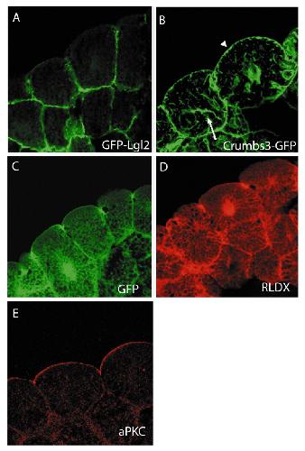 Fig. 1. aPKC, Crumbs3 and Lgl2 show specific localisation in early epithelial cells. (A) GFP-Lgl2 localised exclusively to the basolateral membrane at stage 8. (B) Crumbs3-GFP localised to the apical (arrowhead) and basolateral membrane at stage 8, and to unknown internal structures (arrow). (C) GFP control. The examples shown are after injecting 1 ng of RNA. (D) RLDX control. GFP localised nonspecifically in the cytoplasm, nucleus and points of cell contact, as did the lineage label RLDX. Because of the high yolk content of early Xenopus cells, cytoplasmic fluorescence of the controls has a latticed appearance. This is very distinct from the localisation of the fusion proteins shown. (E) Antibody staining showing that aPKC localises to the apical membrane.