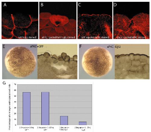 Fig. 7. aPKC and Lgl act by a process of mutual inhibition. (A,B) GFP-Lgl was injected on its own (A) or with aPKC (B). Addition of aPKC inhibited the basolateral localisation of GFP-Lgl2. GFP was visualised by using an anti-GFP antibody. (C,D) Overexpression of Lgl2 inhibited the apical localisation of aPKC but overexpression of GFP did not. (E-G) Lgl2, but not GFP injections, can rescue the apicalisation caused by injecting aPKC. There are more rounded cells in aPKC plus GFP-injected embryos than in aPKC plus Lgl2-injected embryos. The graph shows the average percent of embryos with apicalised cells from three experiments. The experiment was scored blind as for Fig. 2.