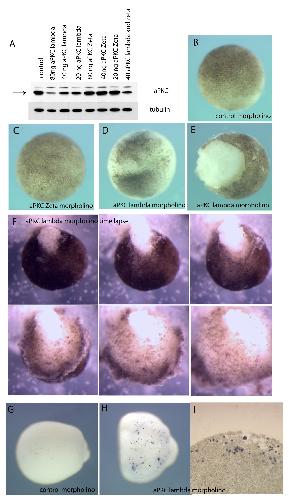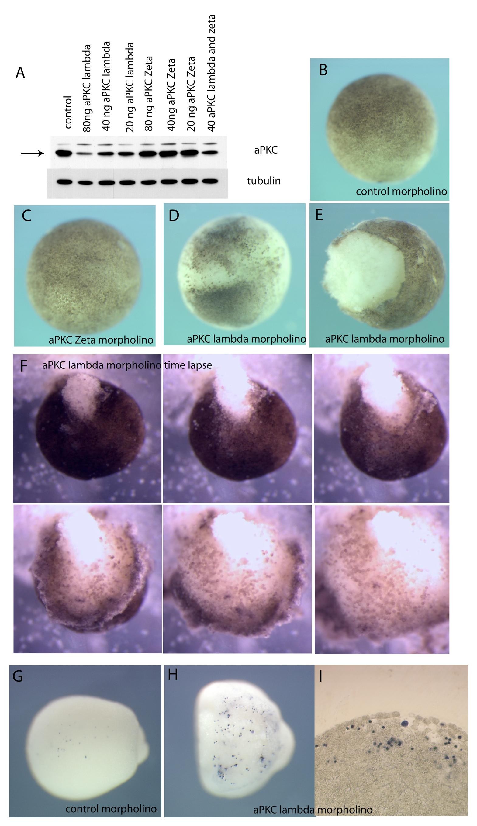 Fig. S1. aPKC MO disrupts epithelial integrity in post-MBT embryos. (A) Western blot of gastrula stage embryos showing that a MO against aPKCl reduces the aPKCl protein level in a dose dependent way (arrow). A MO against aPKCz has no effect and the two together have no additive effect. (B-E) Early gastrula stage embryos injected with various MOs, as indicated. Only embryos injected with PKC l MO show ectodermal disruption, (D) Embryo with vitelline membrane, (E) embryo with vitelline membrane removed. (F) Time lapse of aPKC l MO-injected embryo showing the development and progression of an ectodermal tear. (G-I) TUNEL assay of control (G) and aPKC l MO-injected (H,I) embryo. There is increased cell death in the aPKC l MO embryo but it is mostly confined to the deep layer of cells (section, I). The ectodermal disintegration does not appear to correlate with increased cell death in the superficial cells. PKCl morpholino sequence, tggtgttgtccctctgtgtcggcat; PKCz morpholino sequence, tttttgaccccatcttgcttggcat.