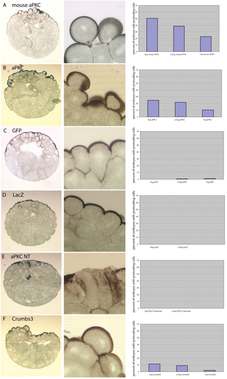 Fig. 2. aPKC overexpression produces rounded, protruding, hyper-pigmented cells. (A,B) Mouse and Xenopus aPKC overexpression produced embryos with protruding superficial cells and extended pigmented (apical) surface when compared with controls (C,D). (E) Overexpression of a truncated version of the Xenopus tropicalis protein, PKC NT, which lacks the entire kinase domain, failed to produce this phenotype. (F) Crumbs3 overexpression caused cell protrusion and over-apicalisation, similar to that of aPKC, but was less effective in that the percentage of affected embryos was lower. Quantification was carried out blind, by counting the number of embryos with protruding cells. Right panels show the percentage of affected embryos at each concentration of injected RNA. Each experiment was carried out at least three times and the average is shown.