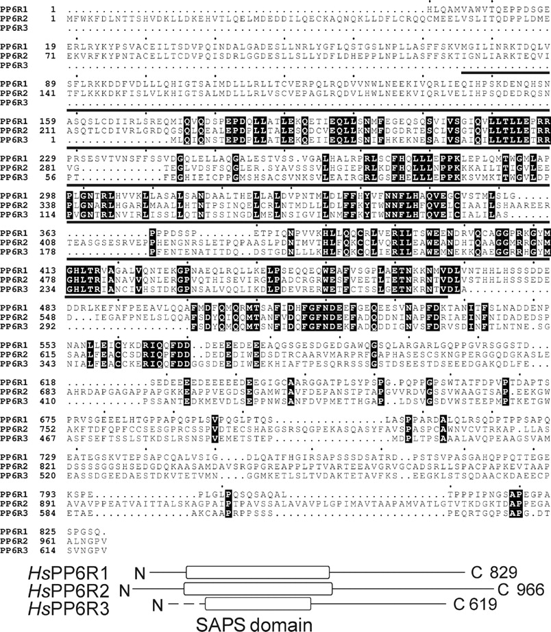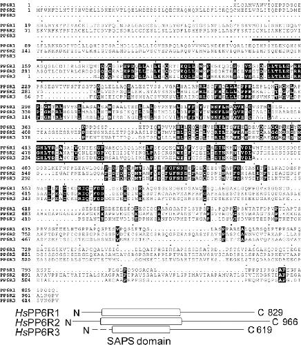 Protein Ser/Thr phosphatases compose a PPP family that includes type-2 PP2A, PP4, and PP6, each with essential functions. The human PP6 gene rescues sit4(ts) mutants of Saccharomyces cerevisiae, and Sit4 phosphatase function depends on multiple Sit4-associated protein (SAP) subunits. We report here finding a SAPS sequence domain encoded in only a single gene each in Schizosaccharomyces pombe, Caenorhabditis elegans, and Drosophila but in three distinct open reading frames in Xenopus, Mus musculus, and Homo sapiens. The SAPS proteins are more divergent in sequence than PP6. Northern hybridization showed differential distribution of the human SAPS-related mRNA in multiple human tissues, named as PP6R1, PP6R2, and PP6R3. Antibodies were generated, distribution of endogenous PP6, PP6R1, PP6R2, and PP6R3 proteins was examined by immunoblotting, and the abundance of mRNA and protein in various tissues did not match. FLAG-tagged PP6R1 and PP6R2 expressed in HEK293 cells co-precipitated endogenous PP6, but not PP2A or PP4, showing specificity for recognition of phosphatases. The SAPS domain of PP6R1 alone was sufficient for association with PP6, and this predicts that conserved sequence motifs in the SAPS domain accounts for the specificity. FLAG-PP6R1 and FLAG-PP6R2 co-precipitated HA-IkappaBepsilon. Knockdown of PP6 or PP6R1 but not PP6R3 with siRNA significantly enhanced degradation of endogenous IkappaBepsilon in response to tumor necrosis factor-alpha. The results show SAPS domain subunits recruit substrates such as IkappaBepsilon as one way to determine specific functions for PP6.