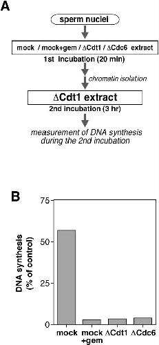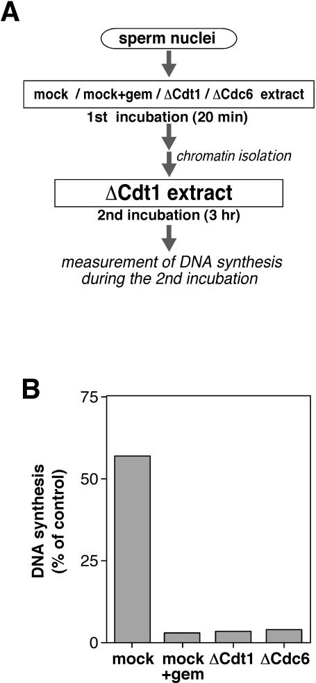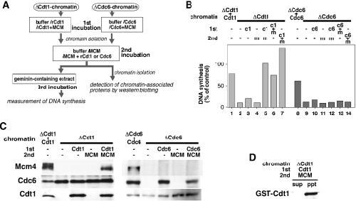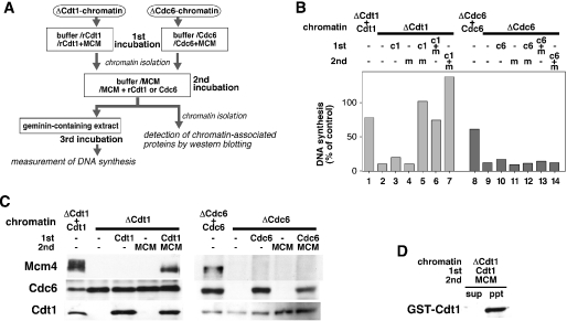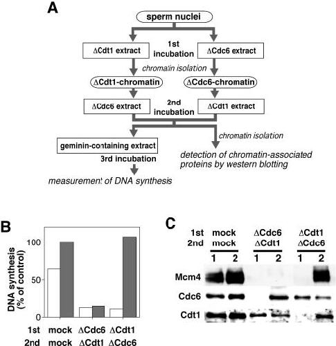 Figure 1. Cdc6-depleted chromatin is unable to replicate in Cdt1-depleted extract. (A) A schematic representation of an experimental procedure. Xenopus sperm nuclei (100 000 nuclei) were incubated for 20 min with 20 μl of Cdt1- or Cdc6-double depleted extract (ΔCdt1 or ΔCdc6, respectively), or mock-treated extract in the absence or presence of 0.5 μM recombinant geminin (mock or mock + gem, respectively). After the incubation, 2 μl of chromatin fraction isolated from each extract was incubated for 3 h with 10 μl of Cdt1-single depleted extract supplemented with [α-32P]dATP (20 kBq). (B) Chromatin after the incubation with mock-treated extract without or with geminin (mock or mock + gem, respectively), Cdt1-depleted extract (ΔCdt1), or Cdc6-depleted extract (ΔCdc6) was isolated and further incubated with the Cdt1-single depleted extract. DNA synthesis during the second incubation is represented as a percentage of the radioactivity incorporated into DNA in the Cdt1-depleted extract to that in a mock-treated extract.